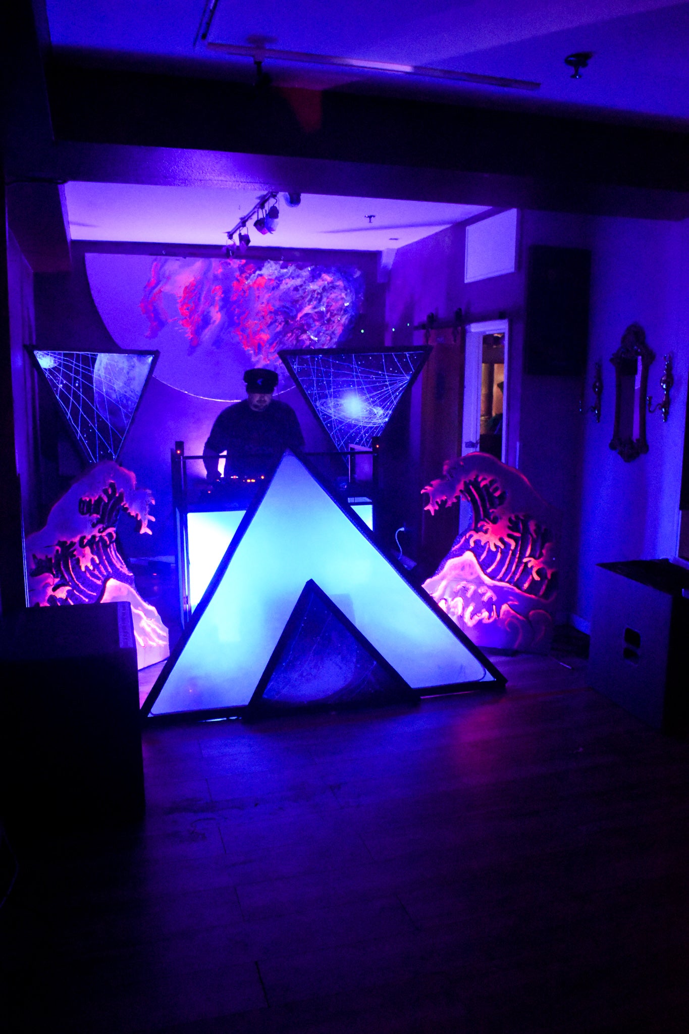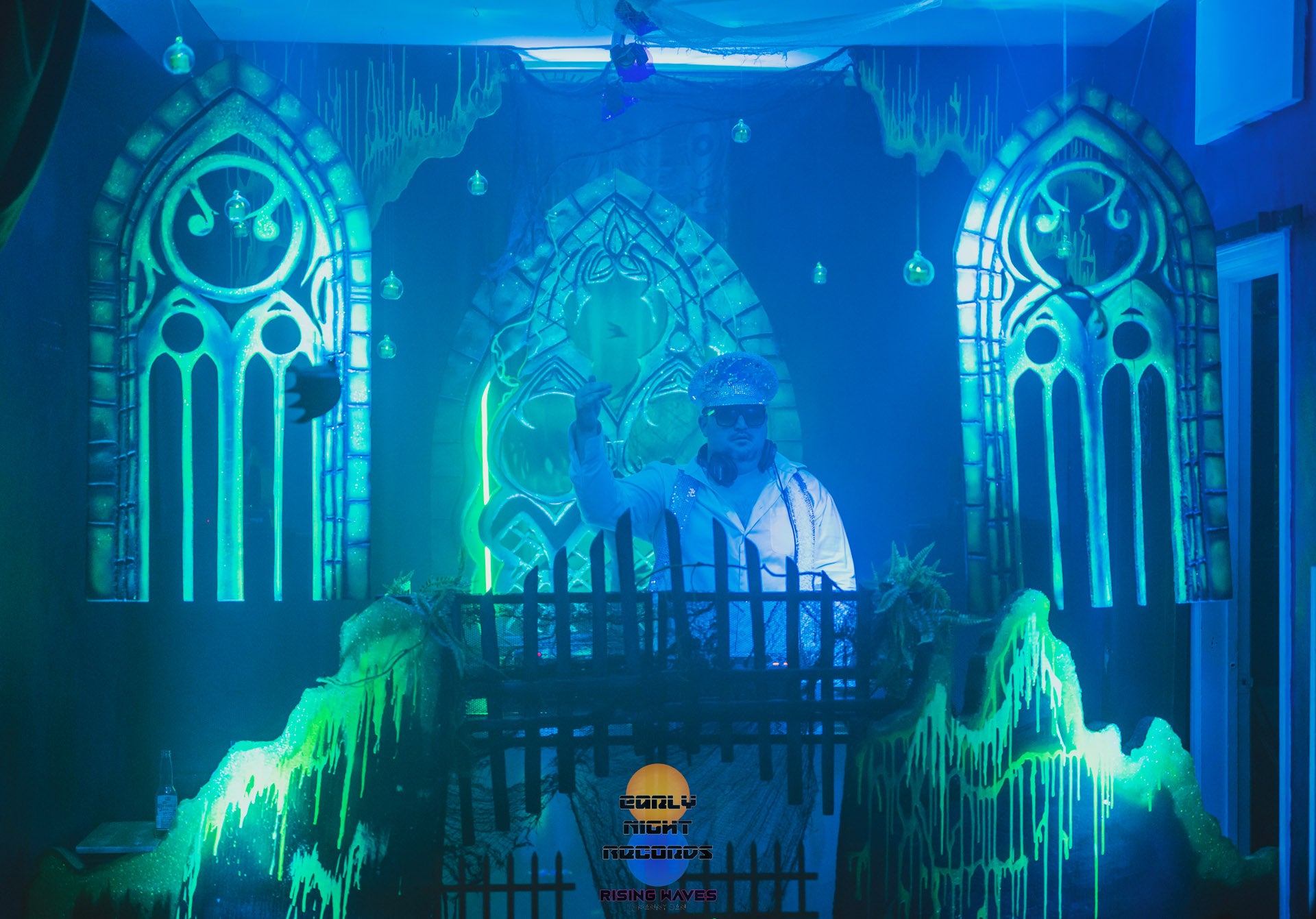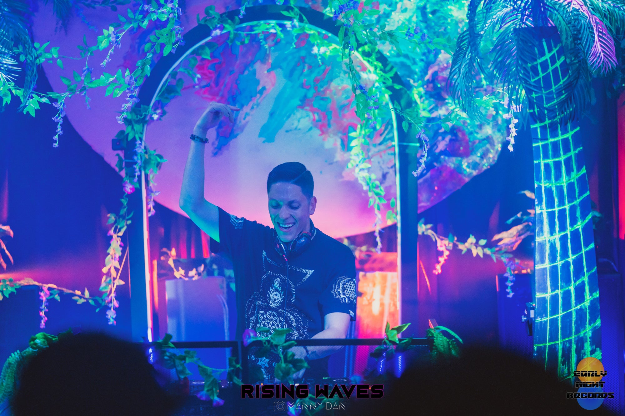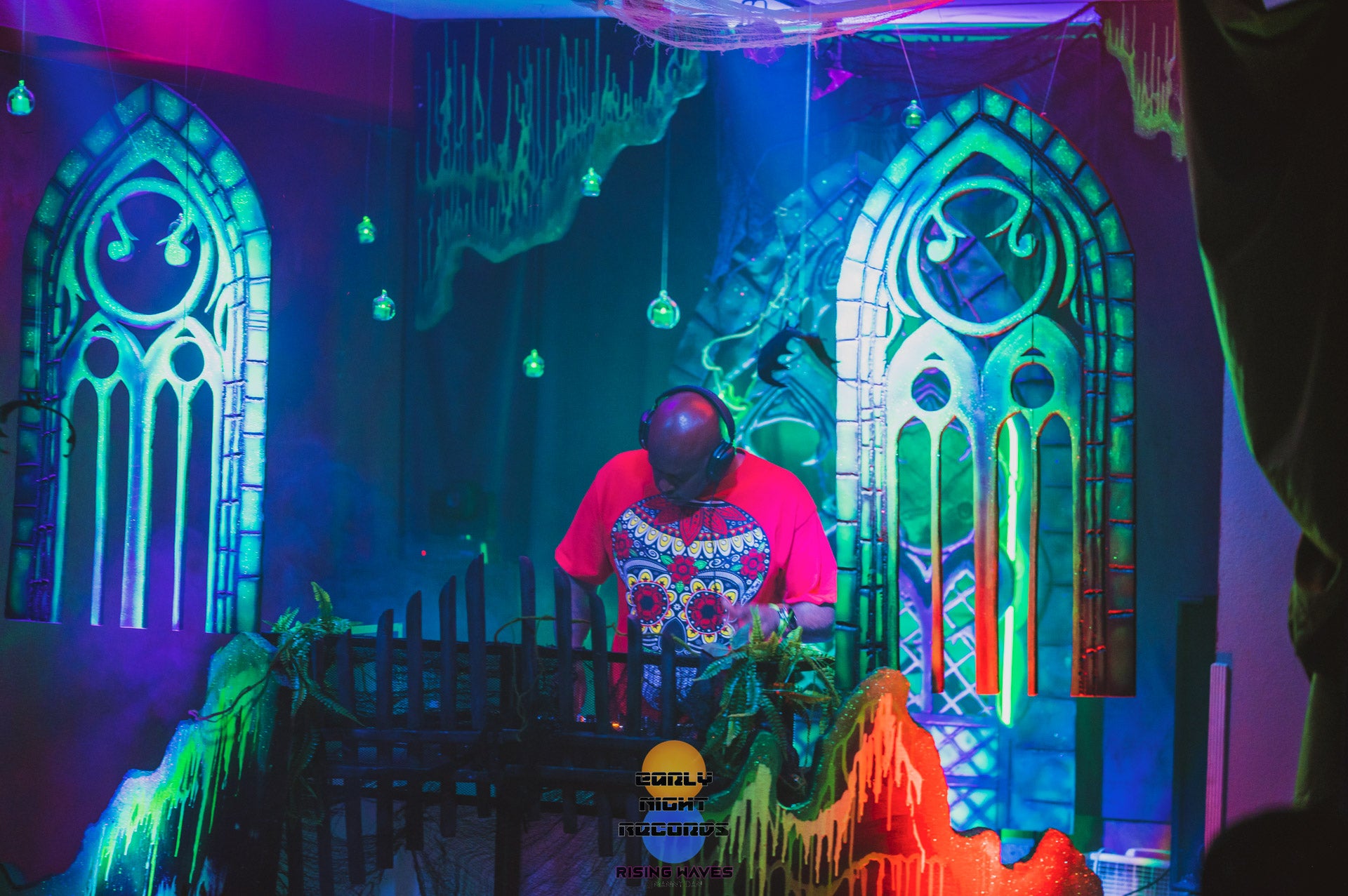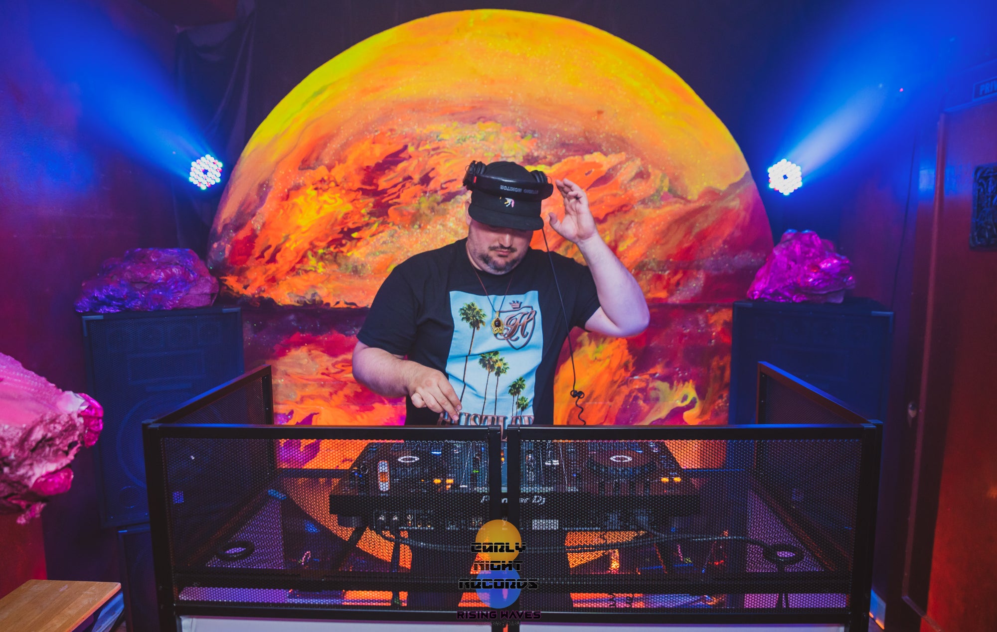 The half planet in the background is UV reactive, as well as the trunks of the digitally inspired palm trees framing the dj booth.