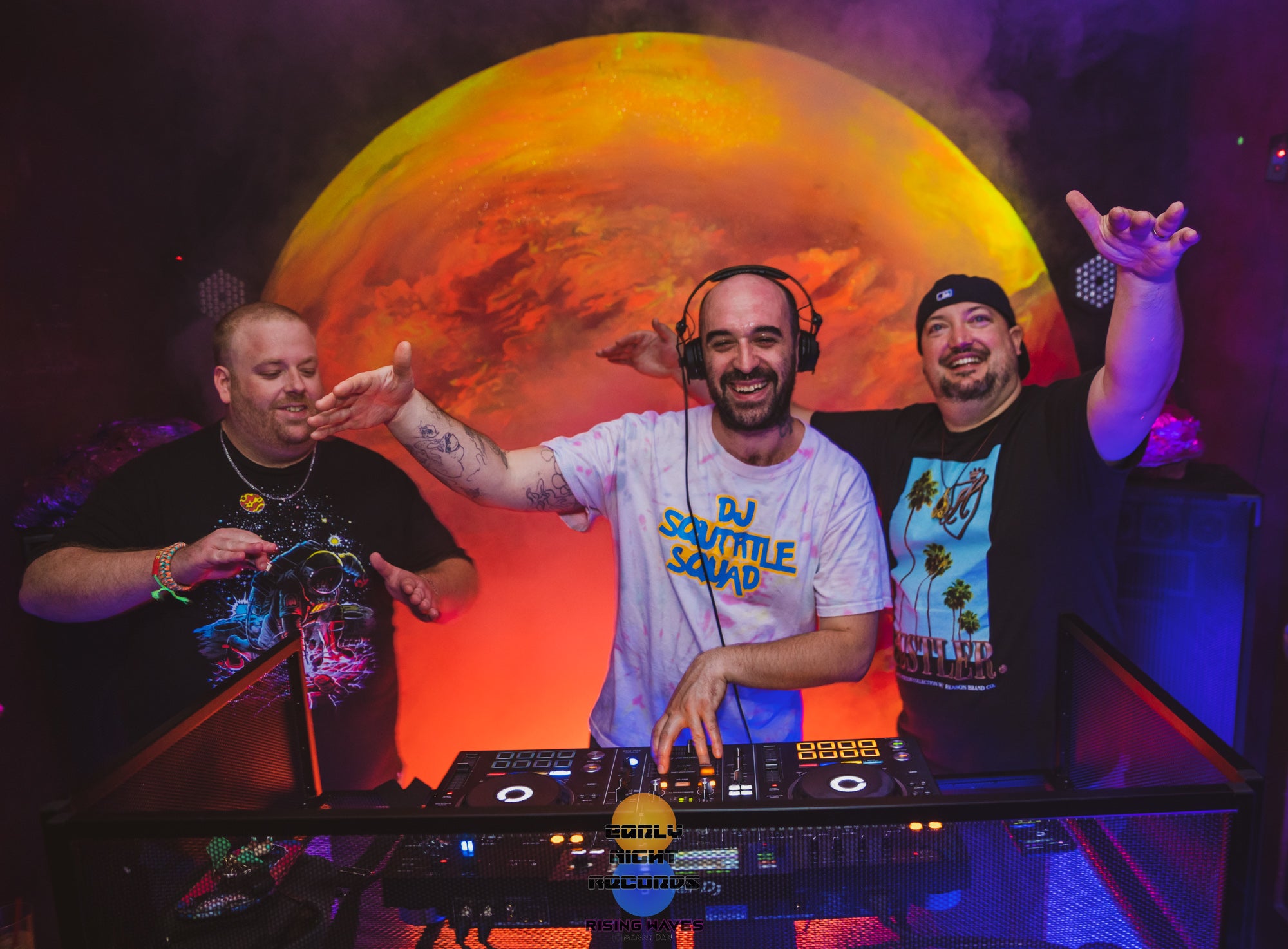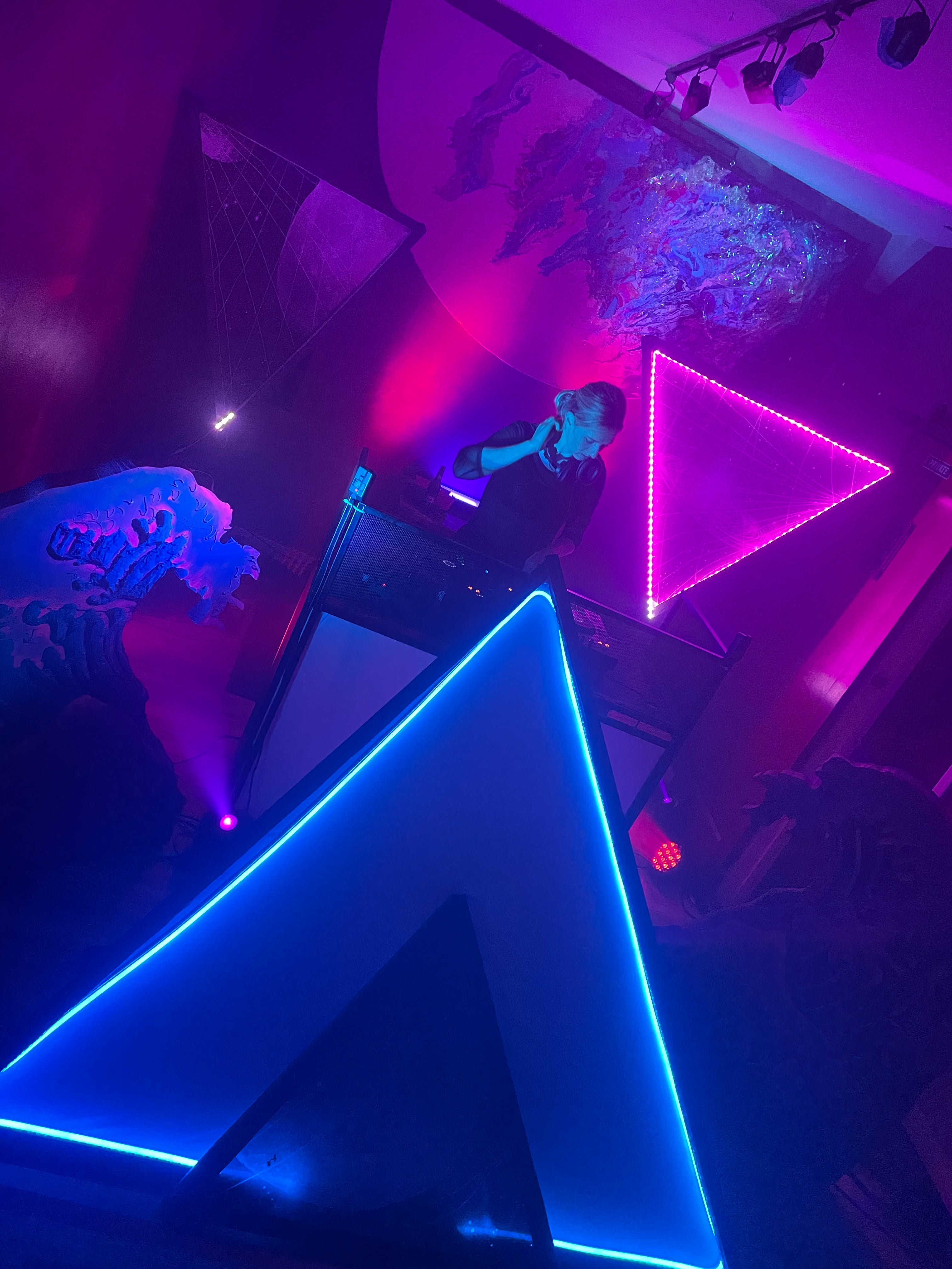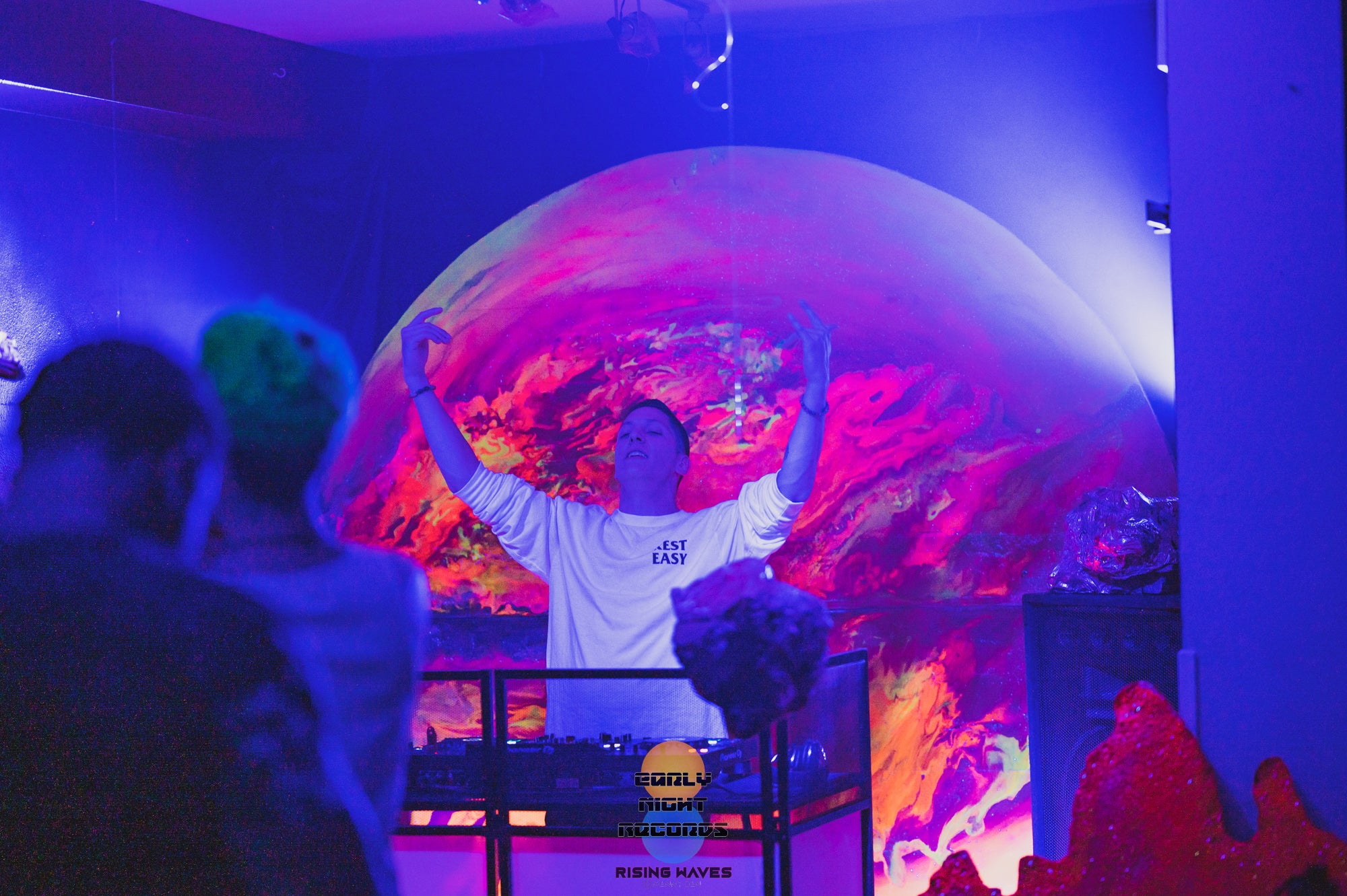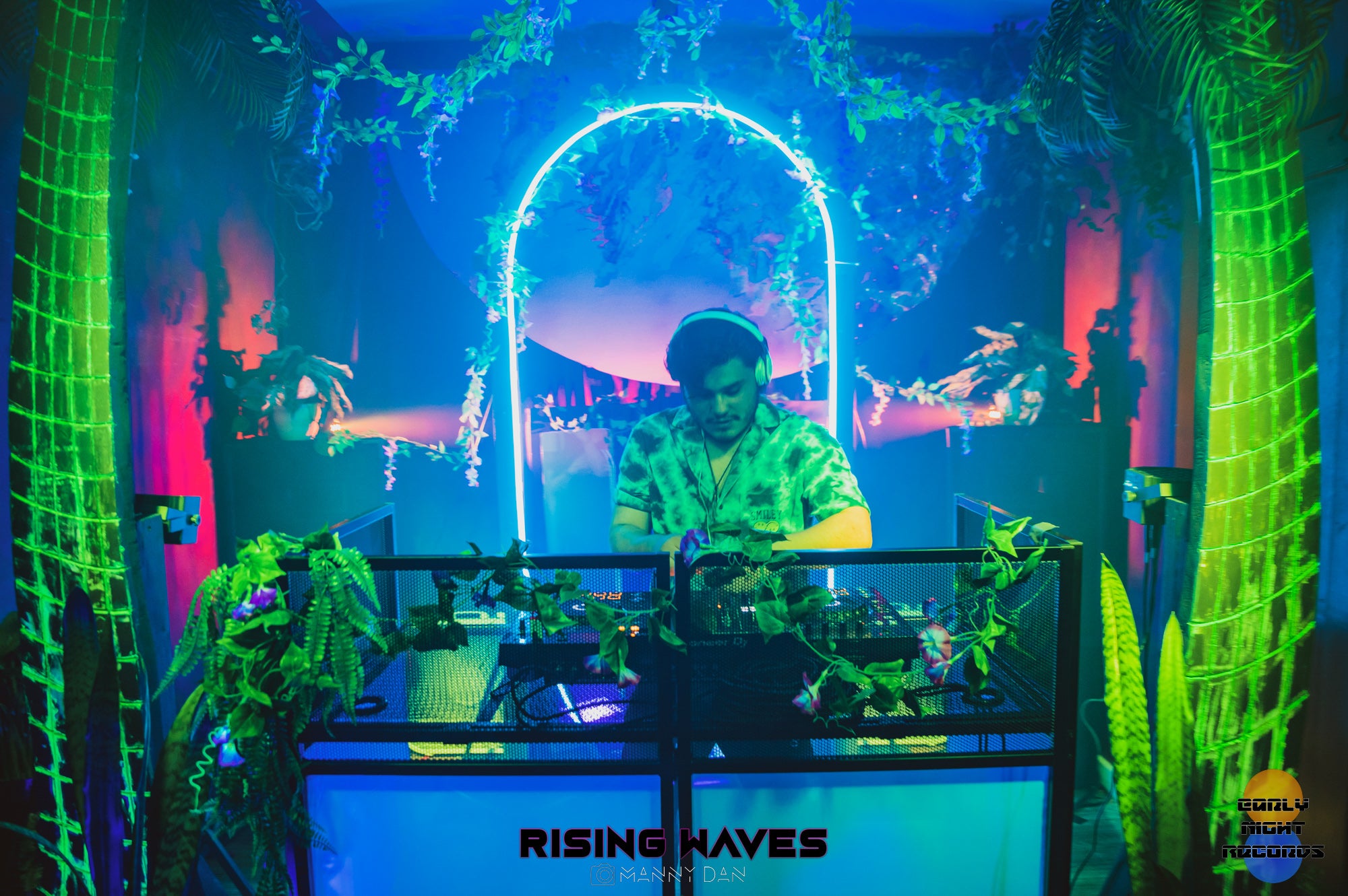The half planet in the background is UV reactive, as well as the trunks of the digitally inspired palm trees framing the dj booth.