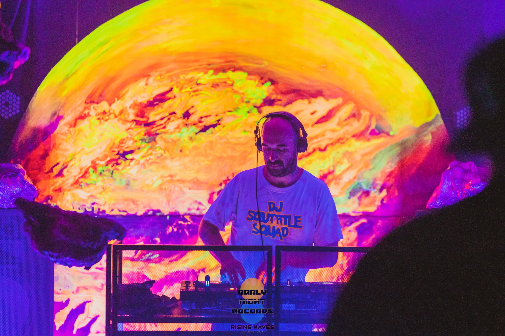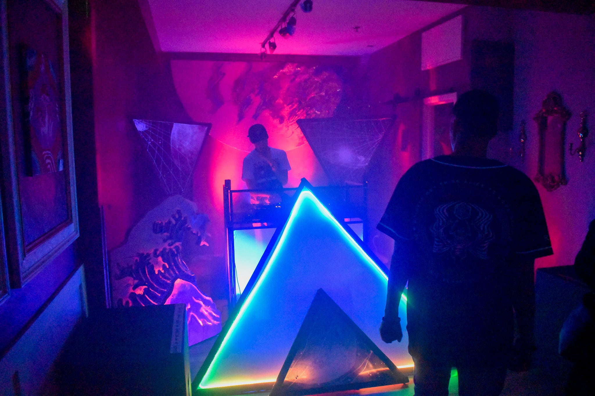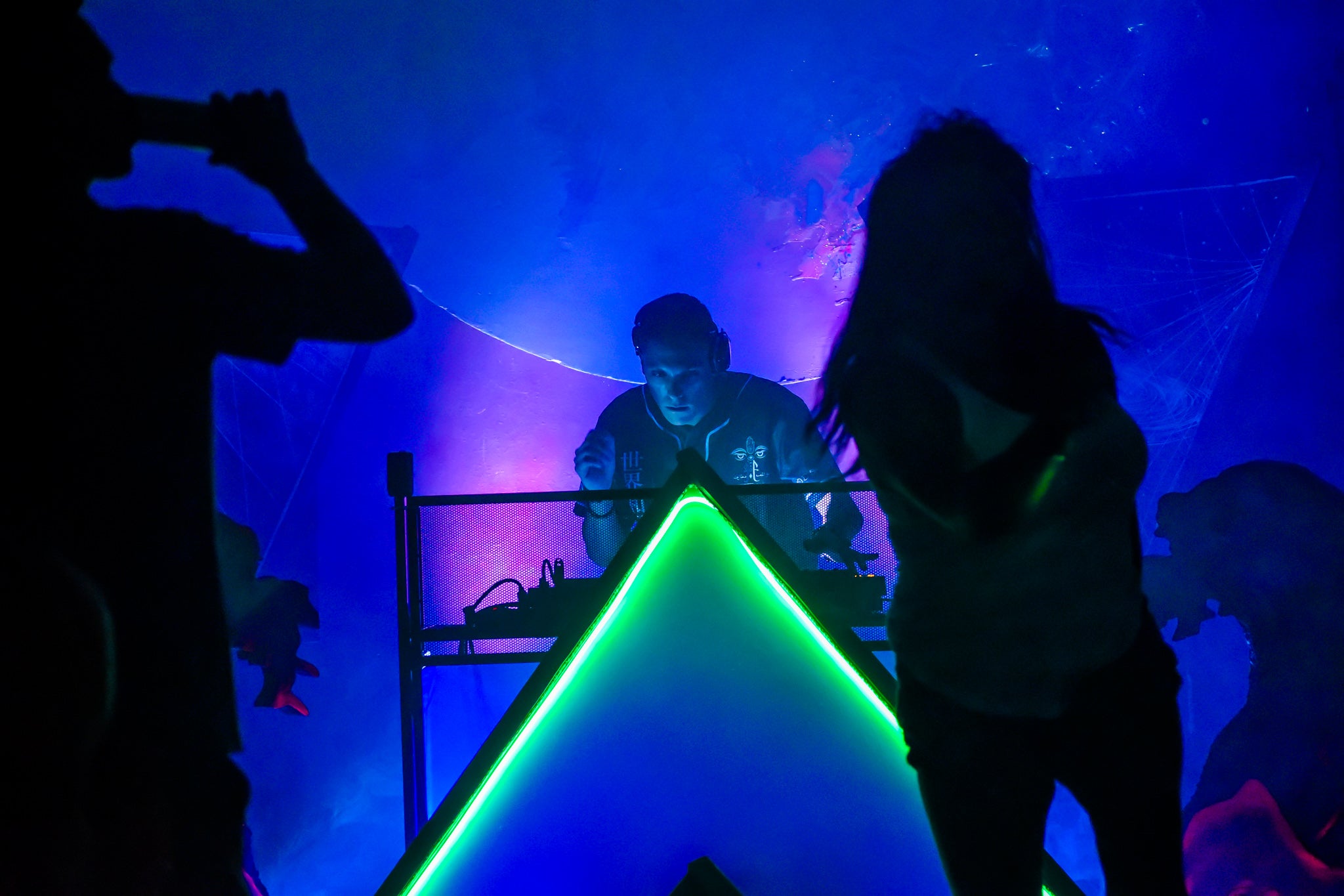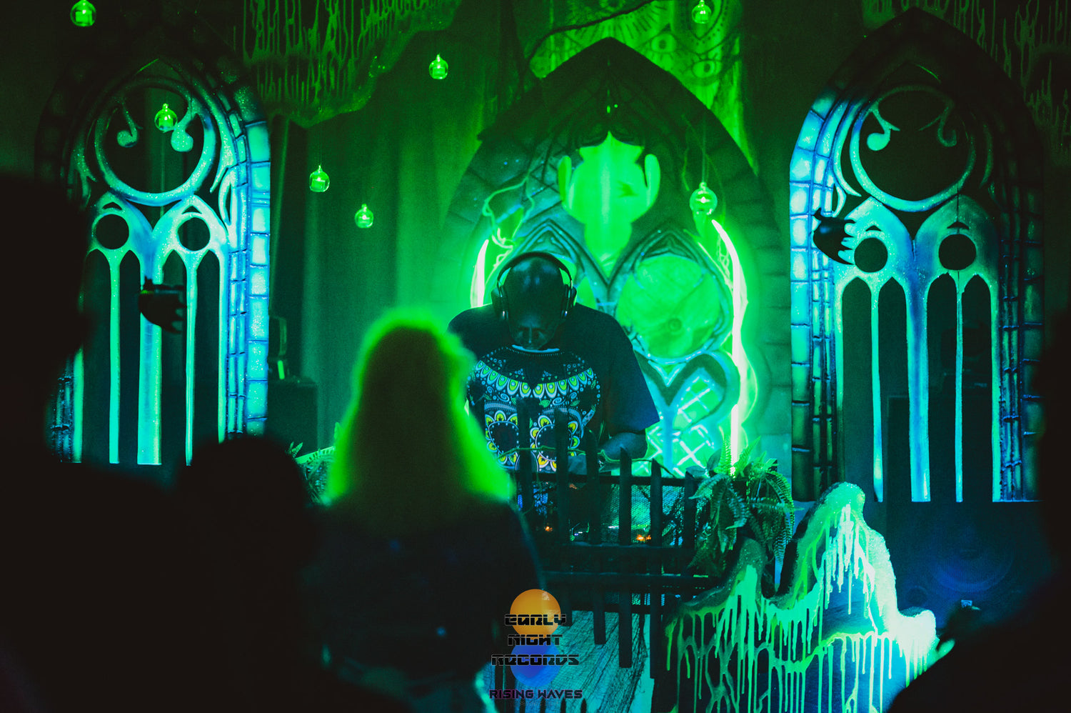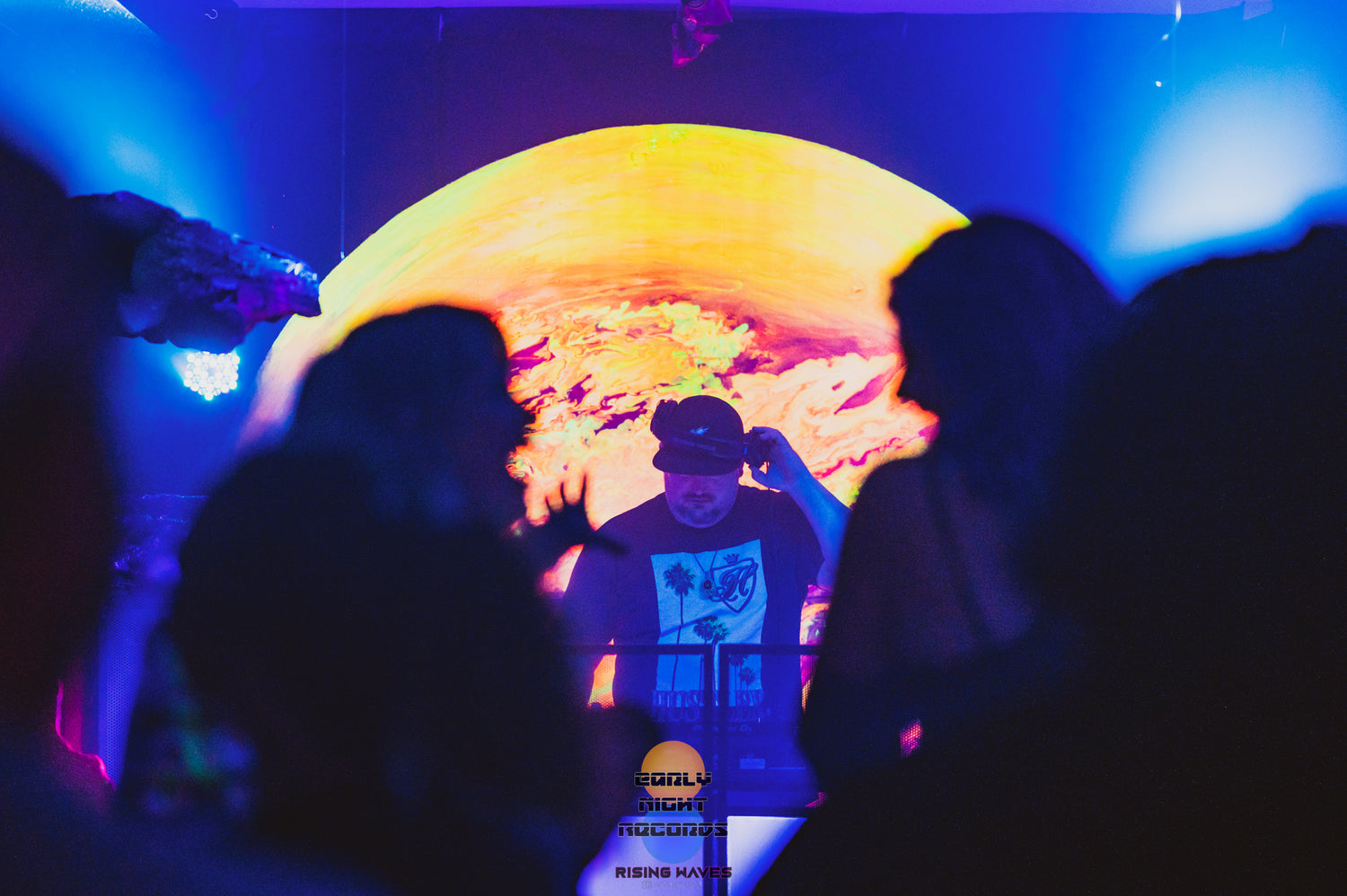 The half planet in the background is UV reactive, as well as the trunks of the digitally inspired palm trees framing the dj booth.