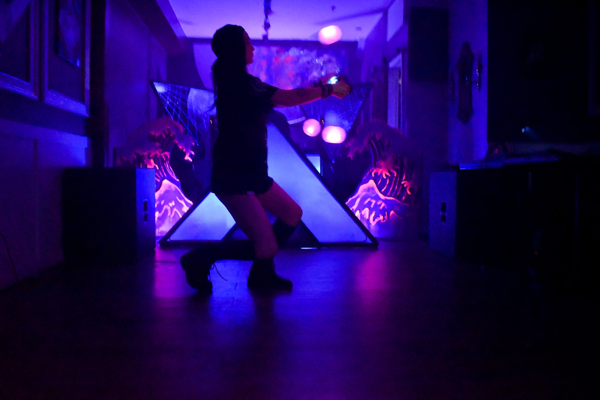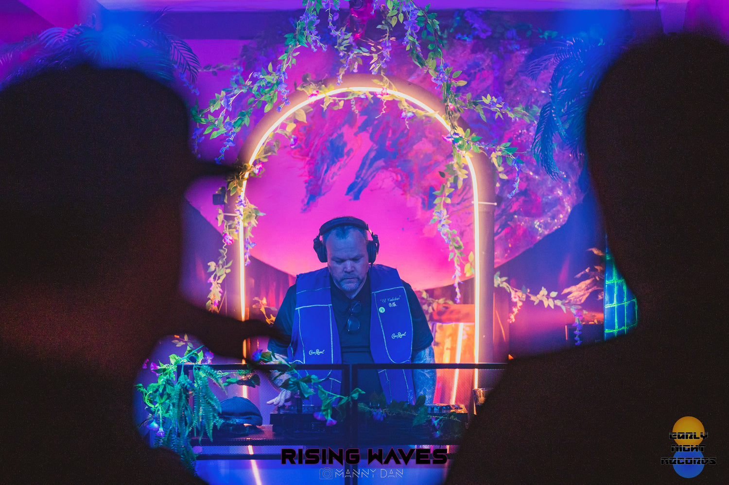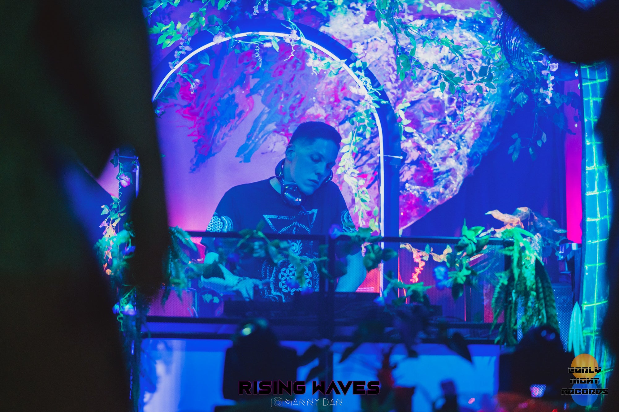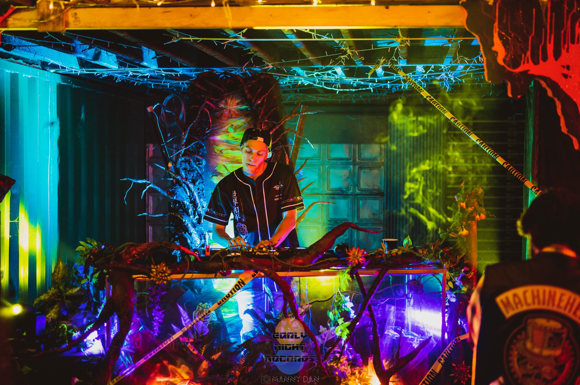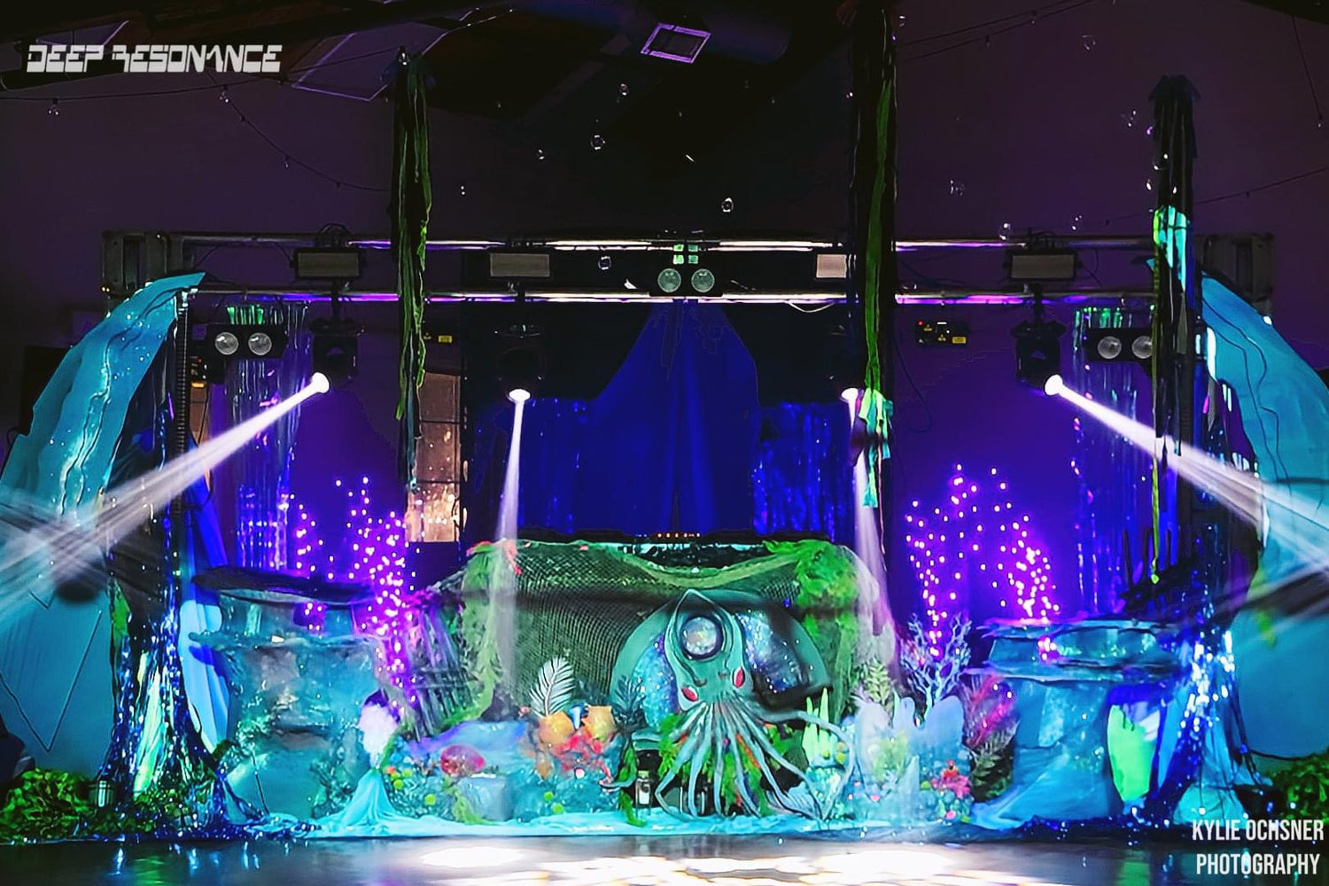 The half planet in the background is UV reactive, as well as the trunks of the digitally inspired palm trees framing the dj booth.